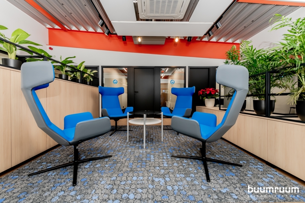 Kujunduses on esile tõstetud olemasolevad industriaalsed elemendid, nagu hoone oranžid teraskonstruktsioonid ja betoon. Ansamblit täiendavad eriti vastupidavad vinüülparketid ja vaipkatted. Helikeskonda parandavad akustilised paneelid seinal ja laes. Interjööri läbivaks aktsenttooniks on ettevõtte sinine tunnusvärv. Jõulist sinist tasakaalustavad valged ja hallid taustatoonid ning puidumustrid. Kujundust rõhutavad mustad detailid.